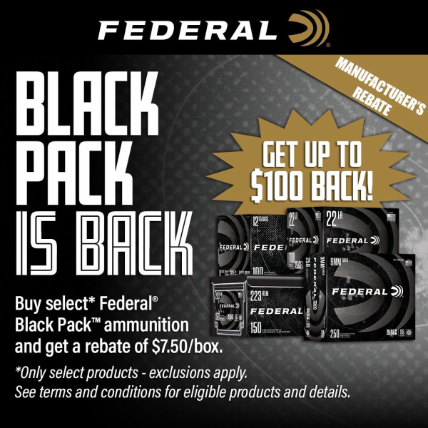 Federal Ammunition announces the return of its Black Pack rebate program. Just in time for Black Friday and the upcoming holidays, customers can purchase qualifying Federal Black Pack ammunition and receive a $7.50 rebate per box.