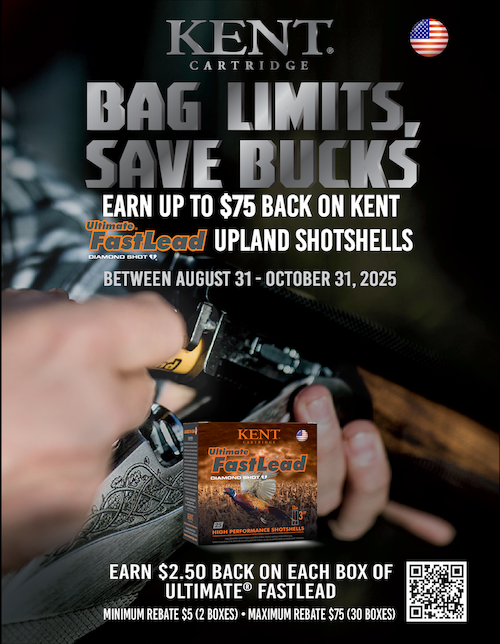 Kent Cartridge introduces our “Bag Limits, Save Bucks” rebate promotion For a limited time, customers can receive up to $75 cash back on qualifying purchases of Ultimate® FastLead® upland shotshells.