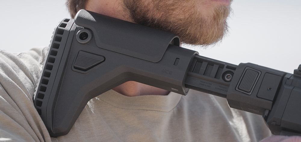 Magpul just added the Universal Carbine Stock (UCS) to fit firearms with vertical 1913 Picatinny rails on the rear of a firearm’s receiver. It features a reversible hinge for both left- and right-handed shooters and, when folded, the stock drops five degrees to ensure it clears the array of charging handle styles, ejection port locations, and various fire controls found on almost every gun with a rear rail.