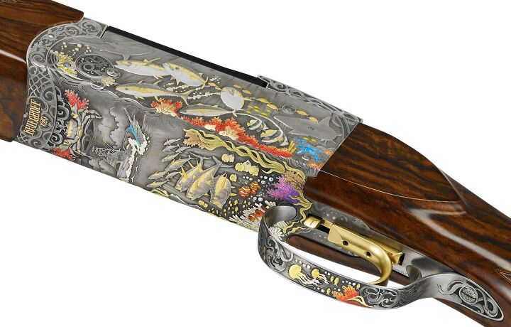 Every year, Krieghoff introduces a Gun Of The Year, a highly embellished version of one of their firearms. The Krieghoff 2025 Gun Of The Year is called Spirit Of The Deep. It’s a K-80 over-and-under shotgun engraved with various marine creatures and scenes.
