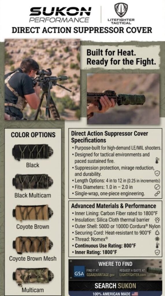 In the world of high-volume shooting—whether you’re running ARs at the range, competing in 3-gun, or prepping for defensive scenarios—suppressors are game-changers for hearing protection and reduced signature. But let’s be real: they get scorching hot under sustained fire, turning your rail into a mirage factory that blurs your sight picture and throws off follow-ups. Enter LiteFighter Tactical’s SUKON Suppressor Direct Action Covers, purpose-built beasts that tackle this head-on. Rugged and heat-resistant, these covers shield your can from direct blast while slashing distortion for crystal-clear optics, even after mag dumps. Available in lengths from 4 to 12 inches and fitting diameters 1.0 to 2.0 inches, they’re a universal fit for popular cans like the SureFire SOCOM or Dead Air Nomad series.